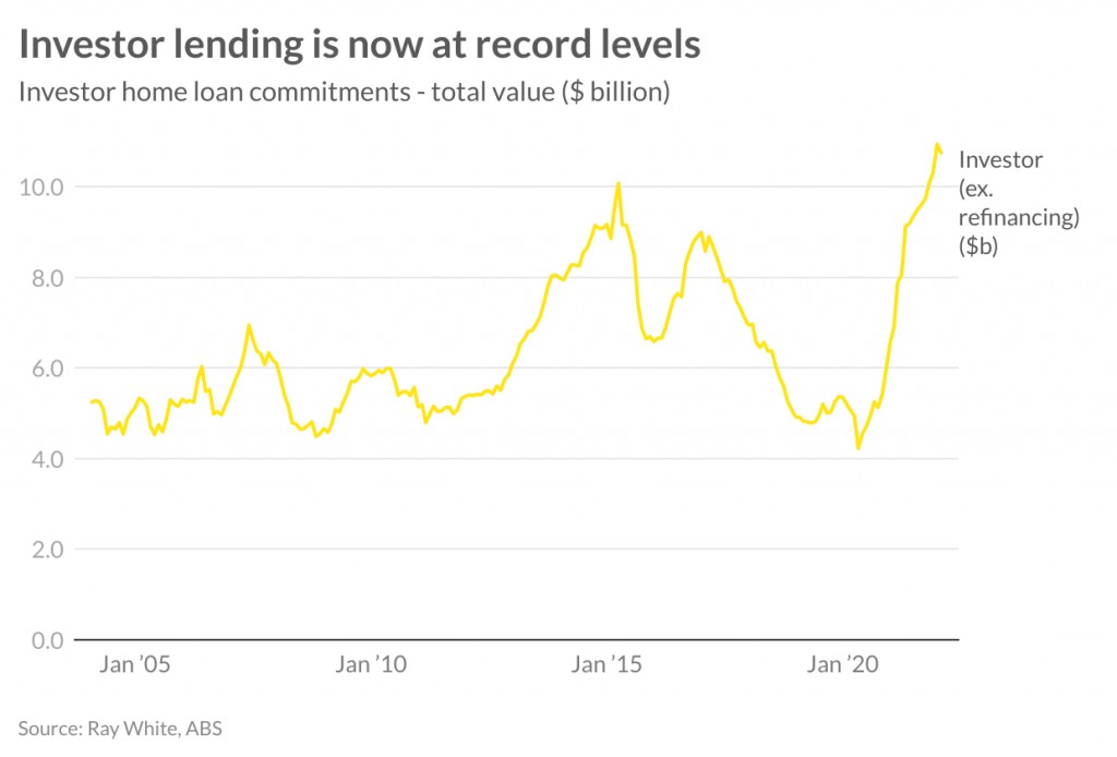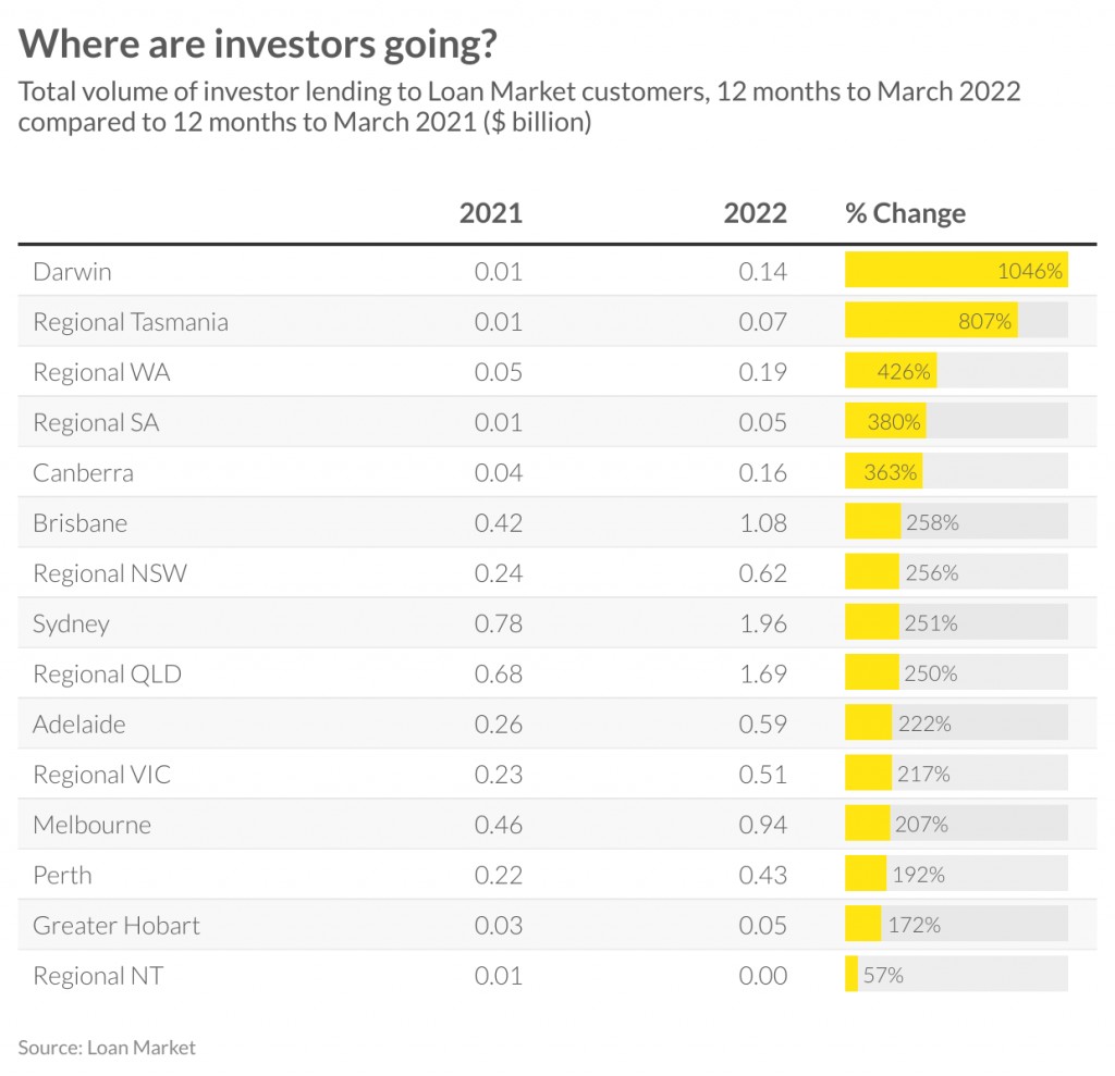 The locations where investors are buying the most are Sydney ($2 billion over the past 12 months), followed by regional Queensland ($1.7 billion). The areas where we are seeing the biggest increases are Darwin, Regional Tasmania and Regional Western Australia.